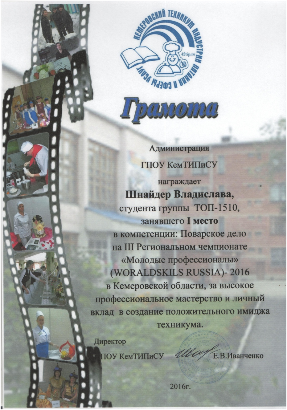 За 1 – ое место в компетенции «Поварское дело» на III Региональном чемпионате «Молодые профессионалы» (WorldSkills Russia) – 2016 в Кемеровской области, за высокое профессиональное мастерство и личный вклад в создание положительного имиджа техникума. |